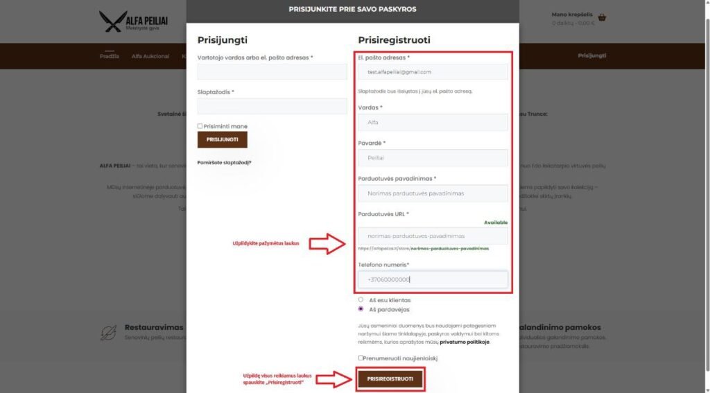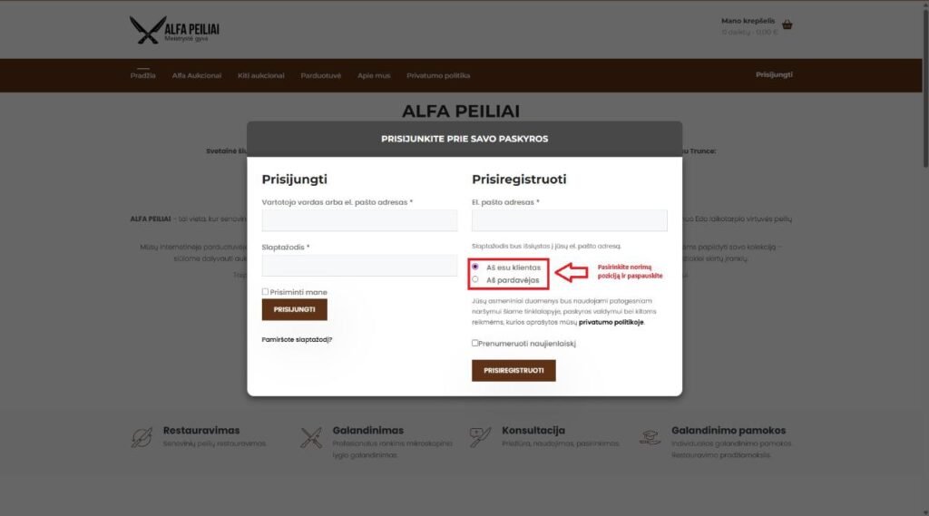 Ši instrukcija skirta naujam pardavėjui, norinčiam prisiregistruoti ir pradėti naudotis „Alfa Peiliai Aukcionai“ pardavėjo paskyra. Toliau pateikiami žingsniai su ekrano nuotraukomis.