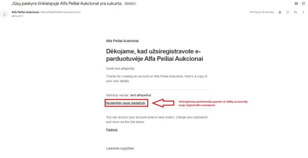 - Į el. paštą gausite laišką „Jūsų paskyra tinklalapyje Alfa Peiliai Aukcionai yra sukurta“.