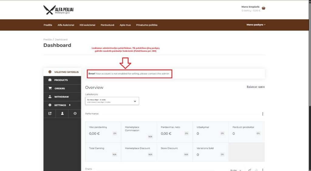 - Pirmą kartą atsidarius „Dashboard“ gali matytis pranešimas „Your account is not enabled for selling, please contact the admin“.