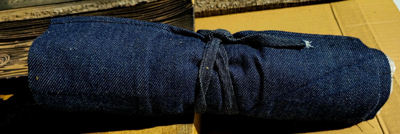Rinkinys supakuotas į tvirtą, rankų darbo džinsinį ritinį, skirtą saugiam laikymui ir patogiam transportavimui.