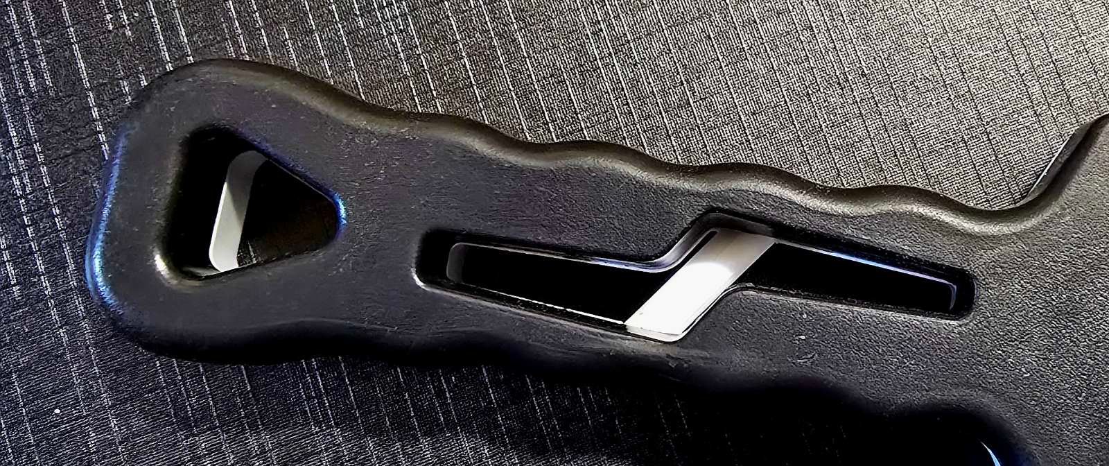 Ergonomiška rankena su neslystančiu paviršiumi. Forma leidžia stabiliai laikyti tiek naudojant griovelius, tiek dirbant su plokštelėmis. Kompaktiškas, bet funkcionaliai išdirbtas.