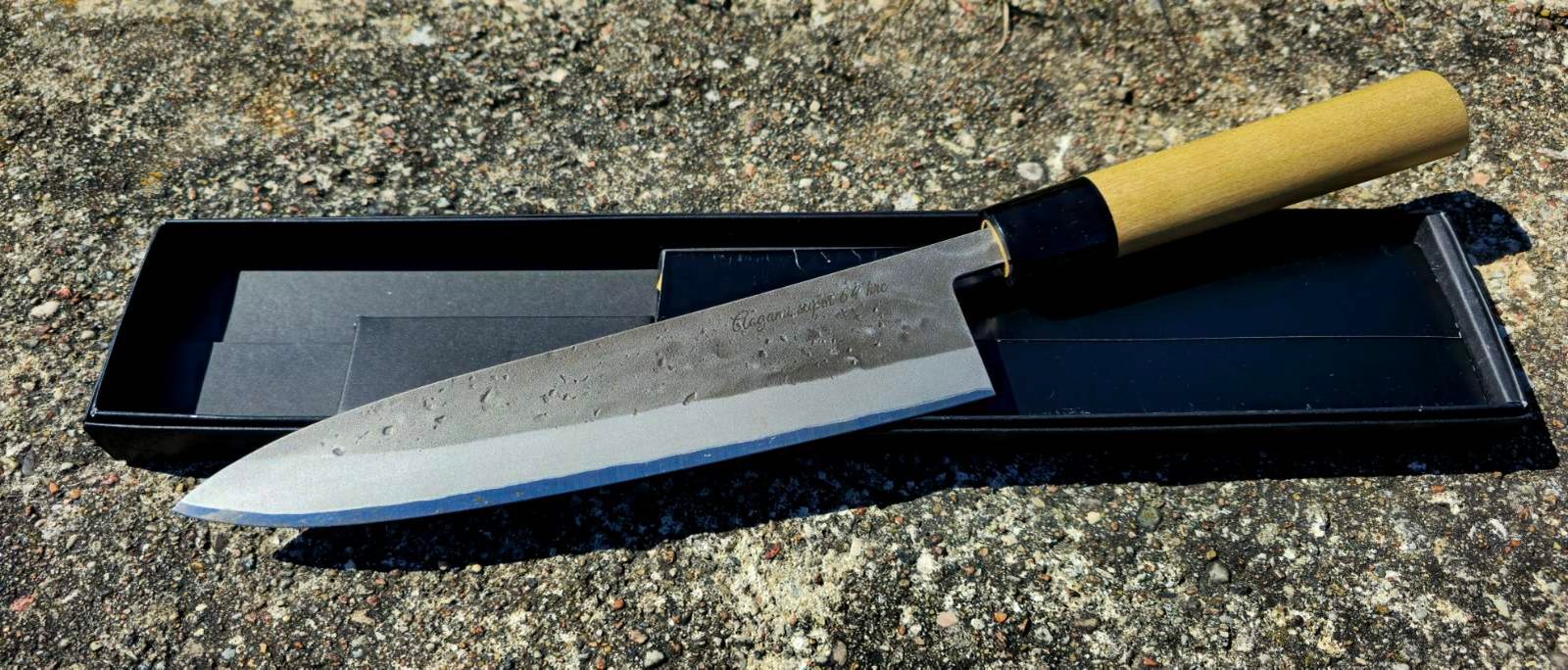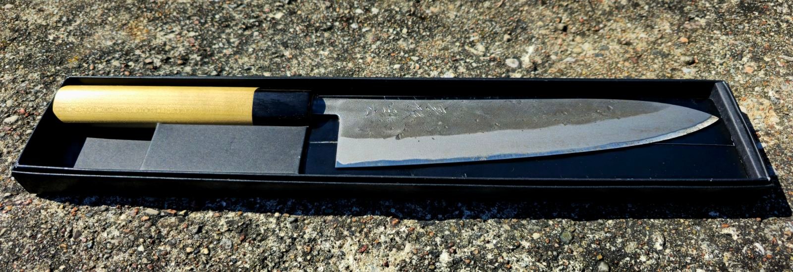 Aogami Super – itin aukštos kokybės anglinis plienas, garsėjantis ilgaamžiu aštrumu ir patikimumu. Dėl ~64 HRC kietumo šis peilis ilgai išlaiko darbinę briauną ir leidžia lengvai dirbti su įvairiais produktais – nuo daržovių iki mėsos ar žuvies.