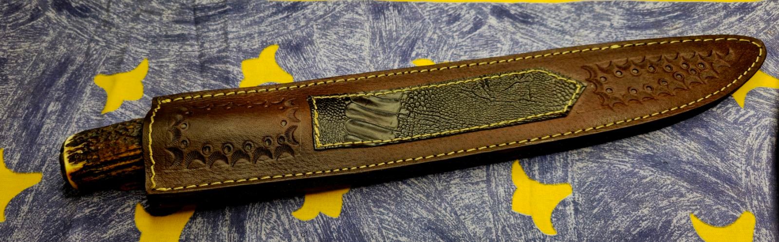 Pridedamas rankų darbo odinis dėklas, pasiūtas iš storos, tvirtos rudos odos ir dekoruotas subtiliais reljefiniais spaudais.