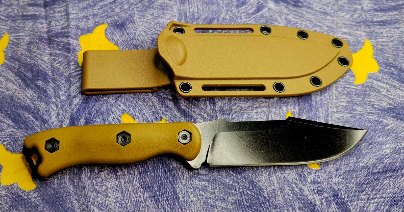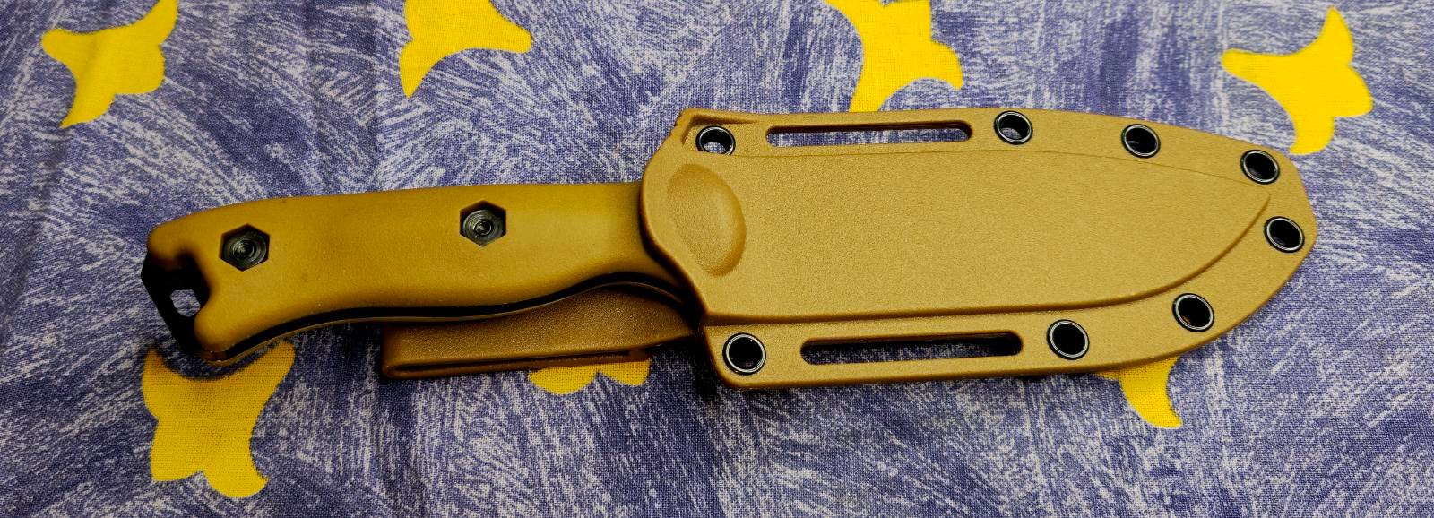 Dėklas: standaus plastiko (Kydex tipo) su montavimo angomis, leidžiančiomis pritvirtinti horizontaliai arba vertikaliai prie įrangos ar diržo. Patikima fiksacija užtikrina, kad peilis išliks savo vietoje net judant.